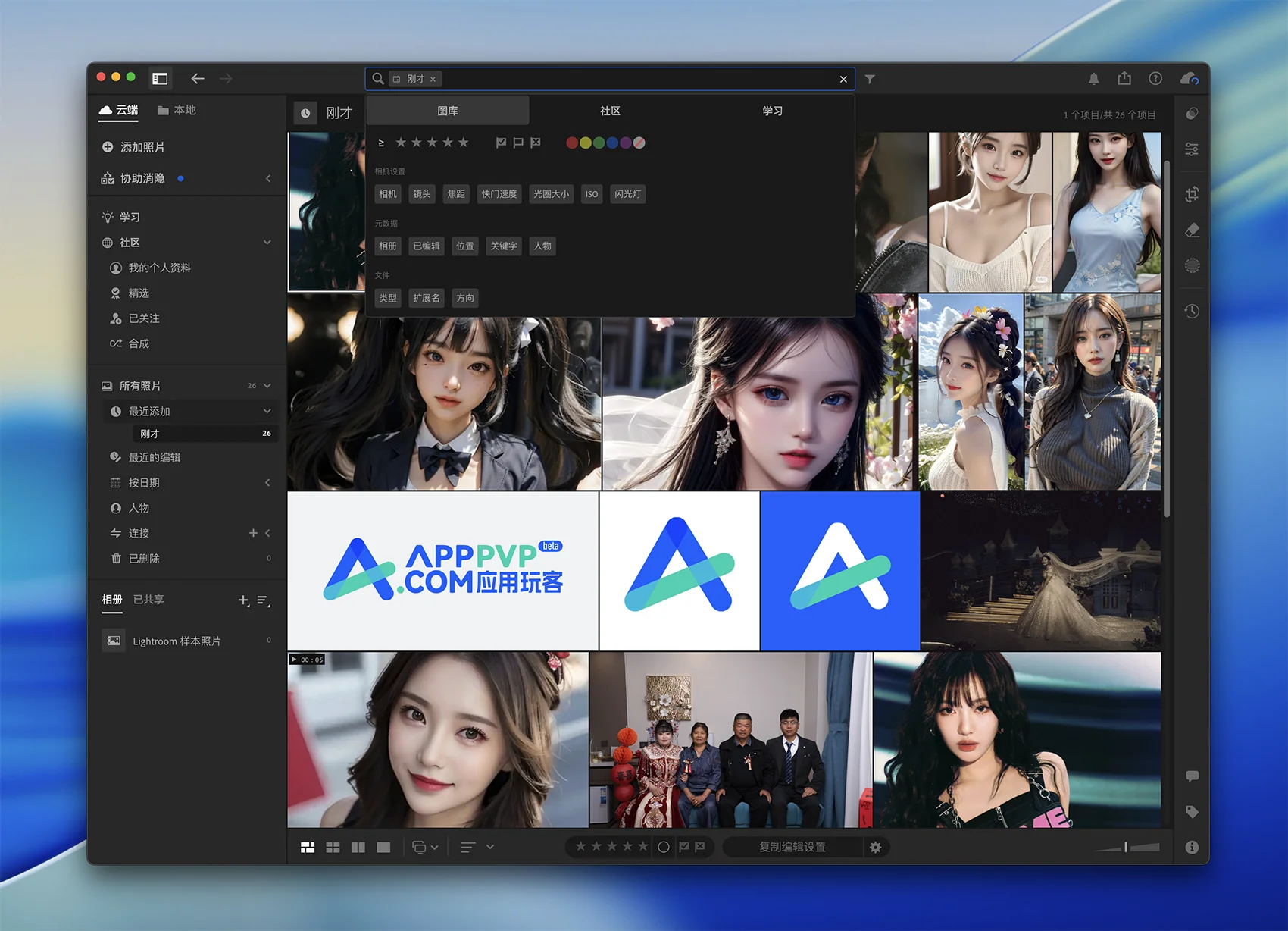 批量处理和自动化:Lightroom具有强大的批处理和自动化功能,可加快工作流程并提高生产效率。用户可以对多个照片应用相同的编辑设置,一键同步修改,或者使用预设和脚本自动执行重复性任务。