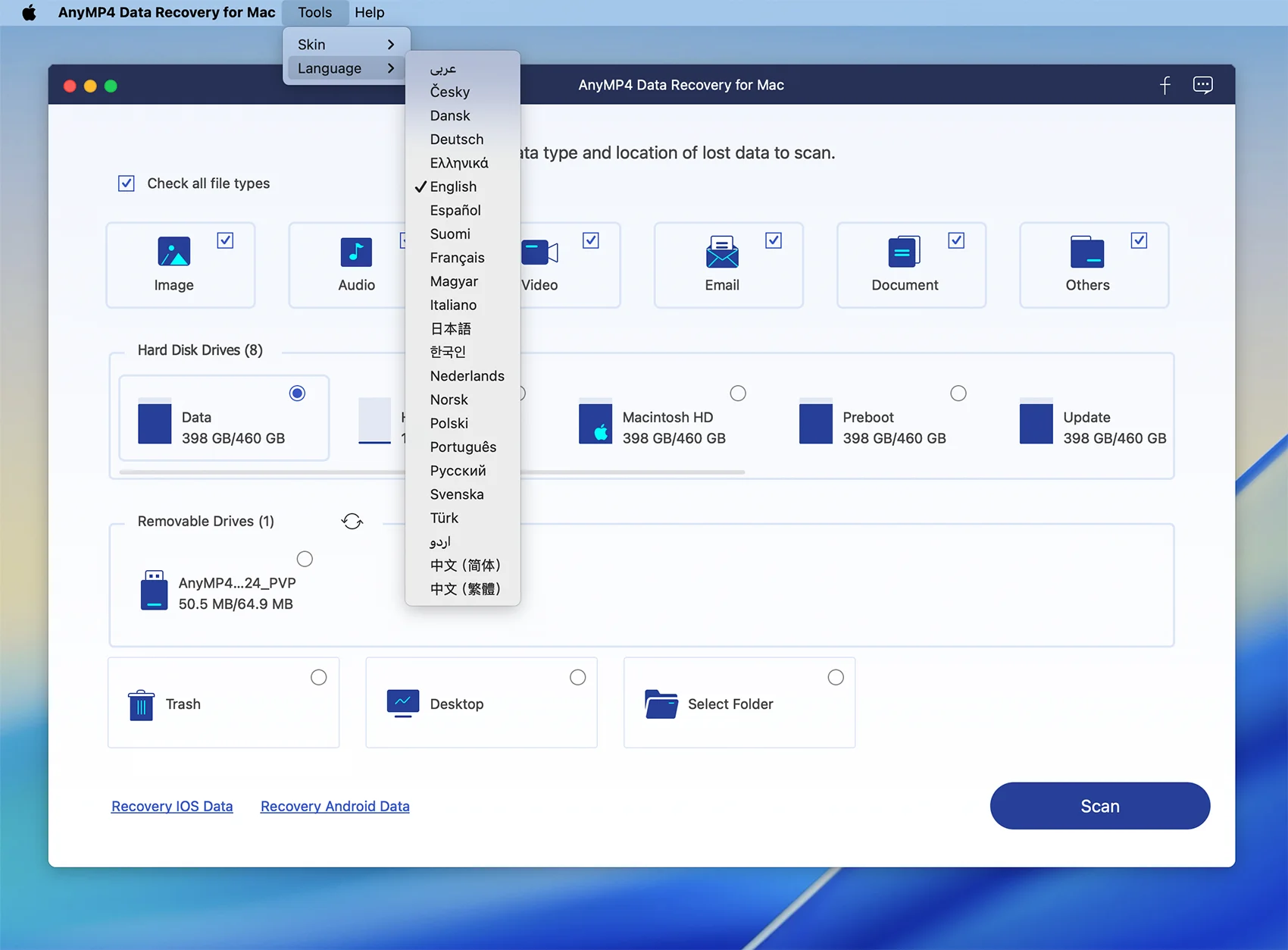 AnyMP4 Data Recovery 可以帮助您轻松恢复计算机驱动器、闪存驱动器、手机或相机上的存储卡/记忆棒中的几乎所有丢失的文件,如照片、文档、电子邮件、音频、视频等。无论您因删除、格式化等原因丢失文件,还是因系统崩溃、病毒攻击等原因导致数据丢失,您都可以使用这款强大的数据检索程序来帮助您。