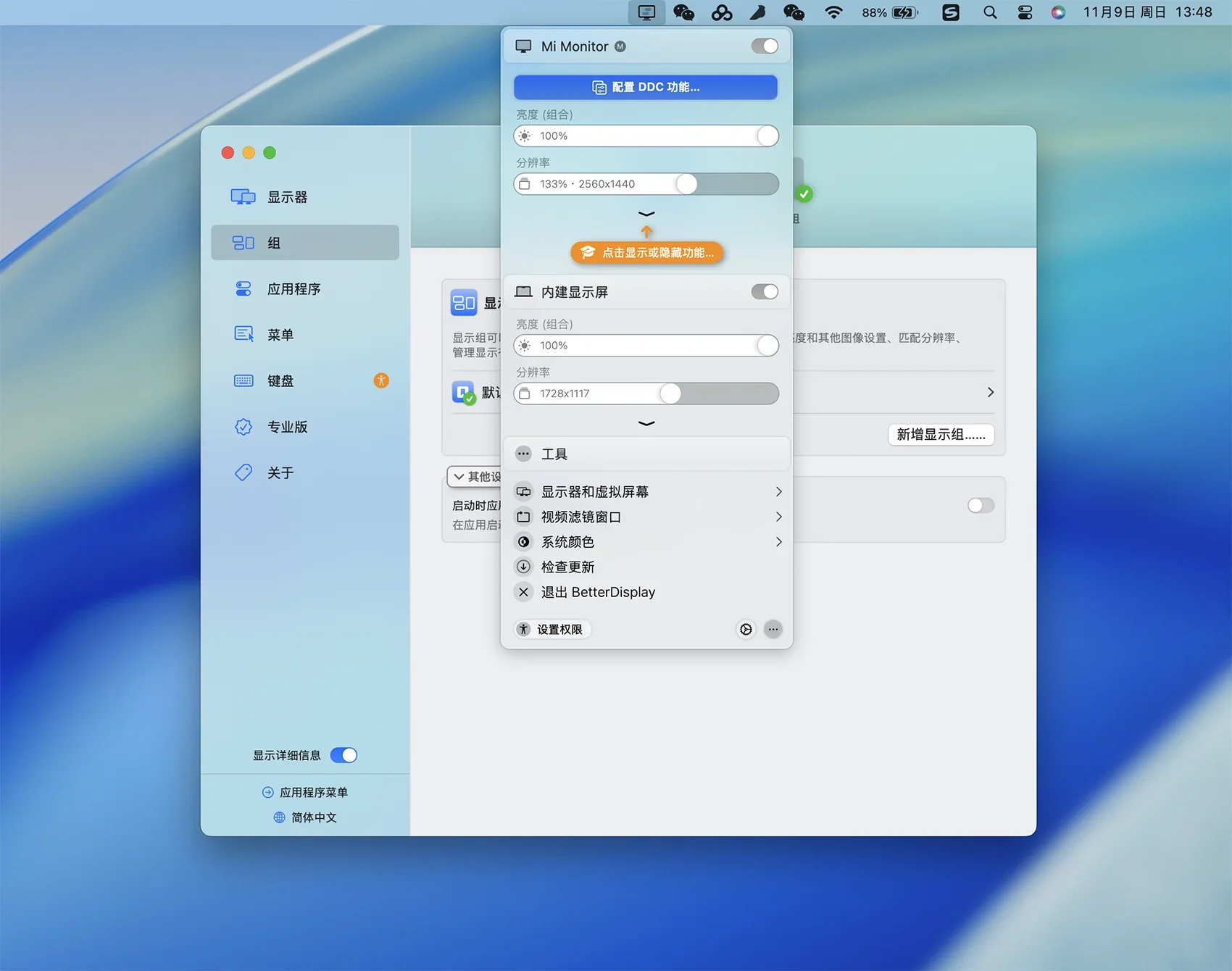 - BetterDisplay 是目前唯一一款适用于所有现代 Mac 的 DDC 控制应用程序(完全支持所有 Apple Silicon Mac 的 DDC,包括 M1 内置 HDMI 端口和 2018 mini 内置 HDMI 端口)。