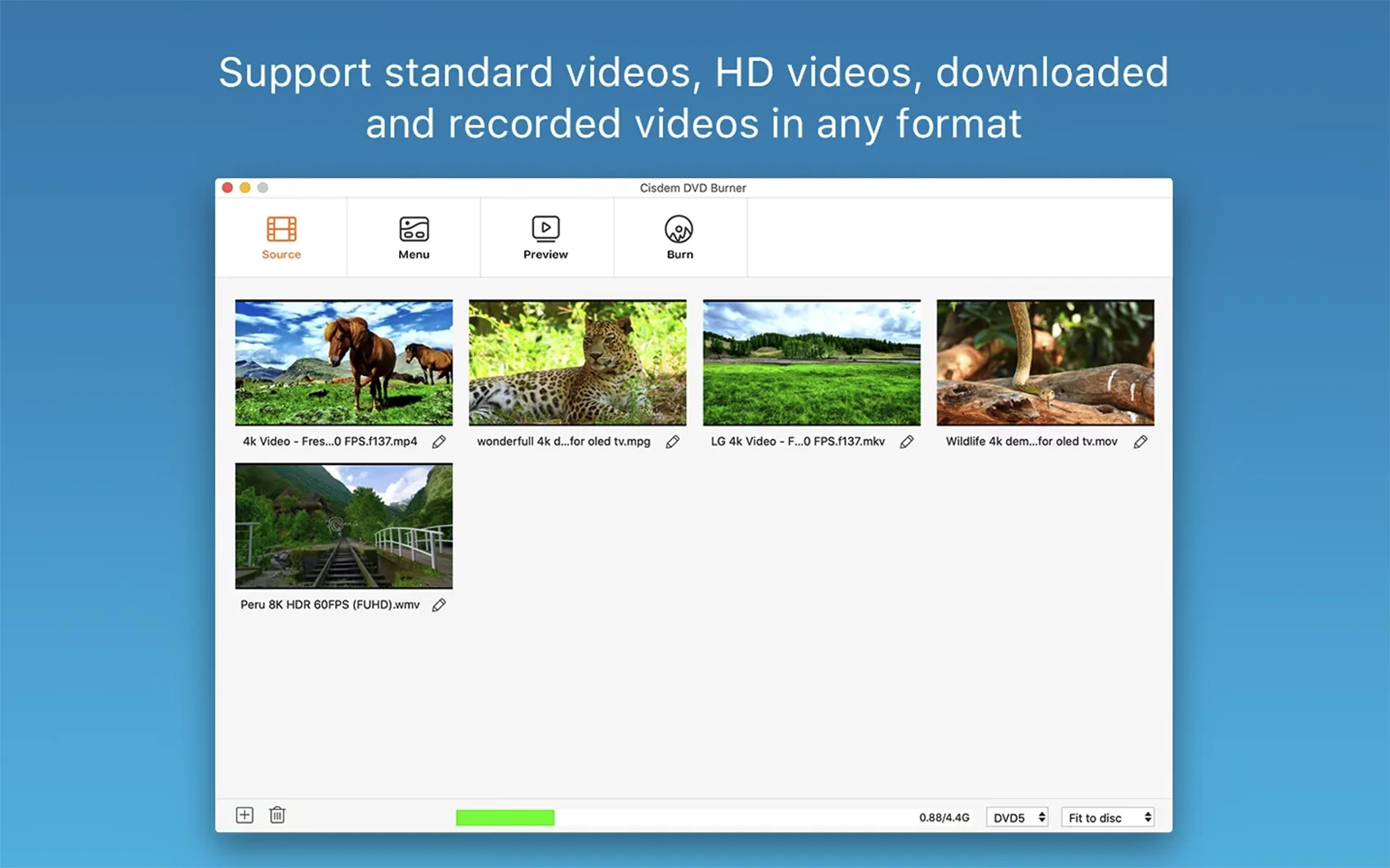 - 支持刻录从YouTube,DAIlyMotion,Facebook,Vimeo等拍摄或下载的任何视频。Mac版Cisdem DVD Burner在视频资源和视频格式上具有强大的兼容性。