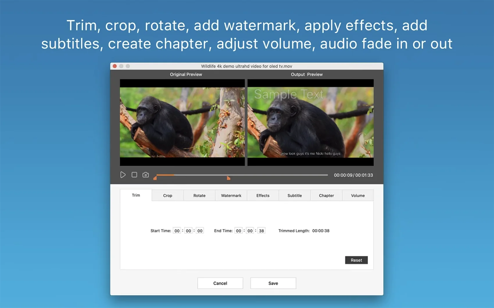 - 旋转和裁剪视频文件以删除信箱,为视频添加特殊效果或水印等。