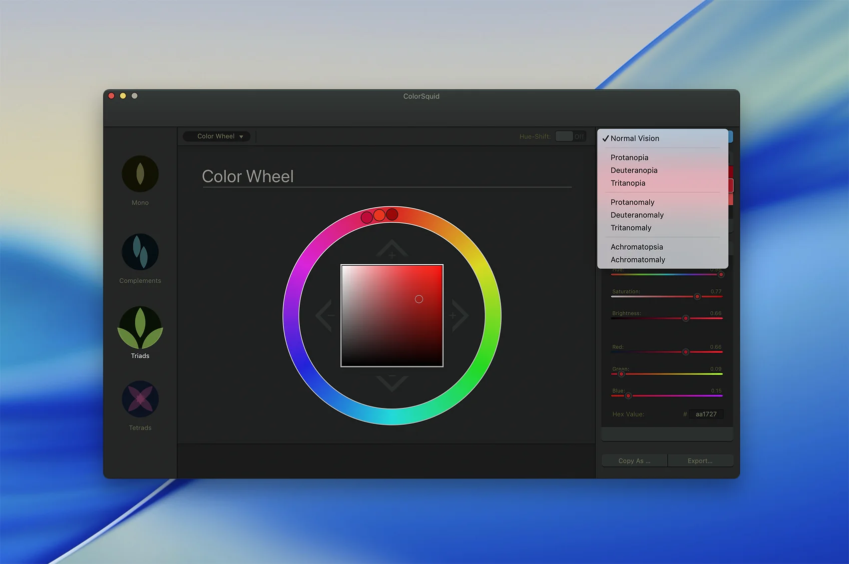 内置的色盲模拟可以快速模拟色盲者如何看待你的调色板。