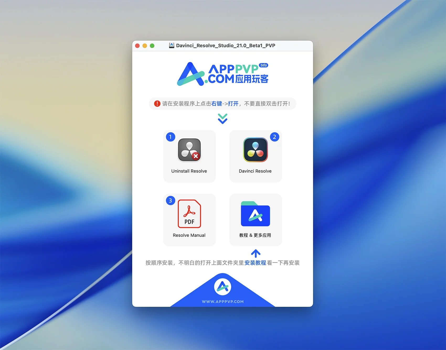 1、打开下载好的 dmg安装包,如果之前电脑安装过达芬奇,先运行第 1 步 Uninstall Resolve 卸载后再安装,新电脑直接从第 2 步开始安装;