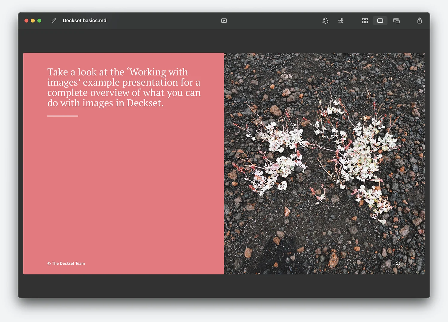 总之,Deckset是一个功能强大且易于使用的演示文稿制作工具,它结合了Markdown的简洁性和自动化排版的优势,使得用户可以快速创建出富有吸引力的演示文稿。