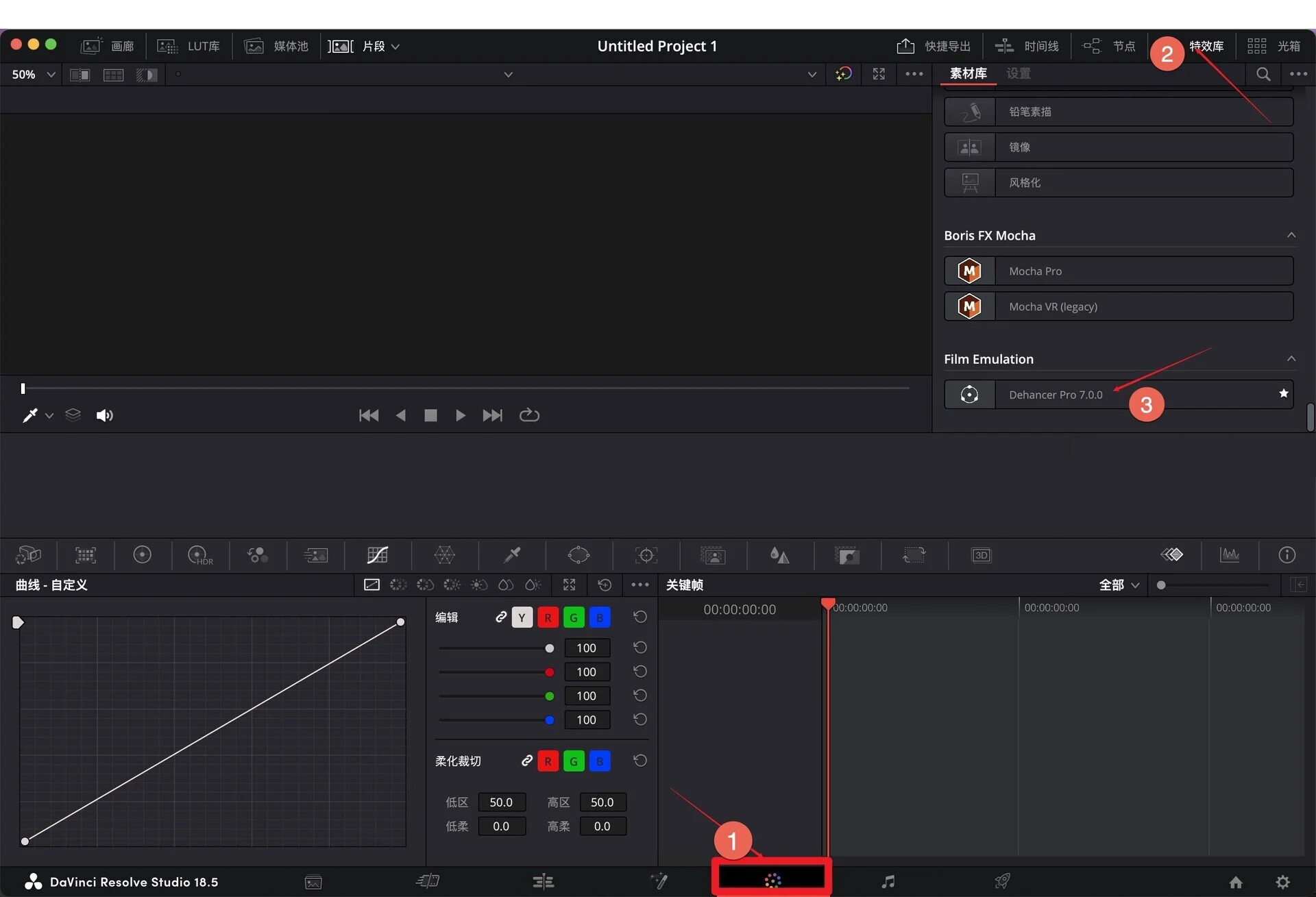插件位置:先点击软件下方工具栏中的调色按钮,然后在特效库中,找到安装好的插件,(按照下方的标注顺序,找到安装好的插件)如图: