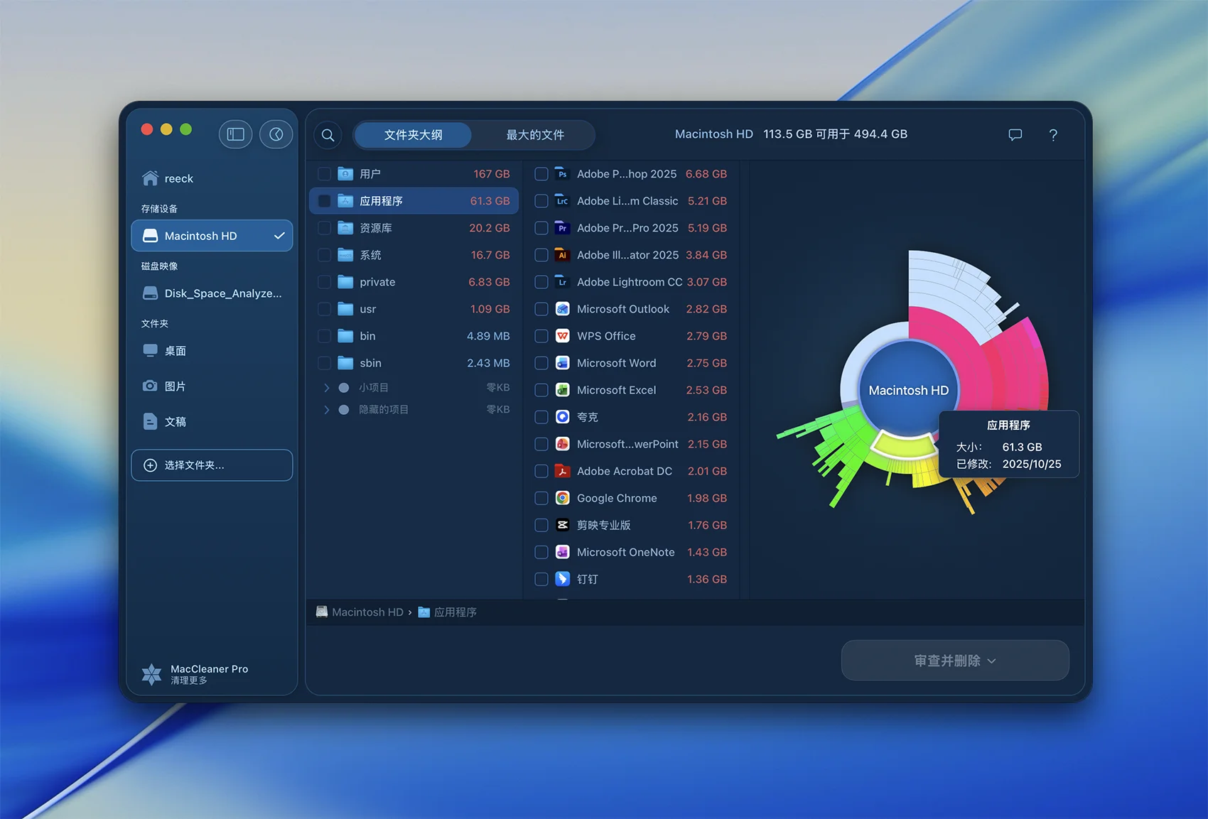 该应用程序是适用于 macOS 的出色硬盘可视化工具和大文件夹查找器,可显示带有方便的旭日形图表的驱动器使用地图。 因此,您可以轻松地检查 Mac 磁盘空间使用情况,找出占用硬盘空间的原因,并在几分钟内释放大量空间。
