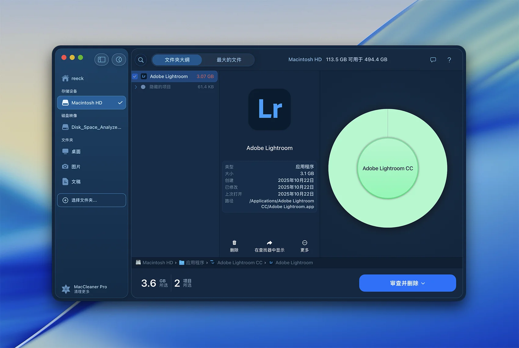 当您的 Mac 启动磁盘已满时,该程序可以将文件和文件夹收集到一个集合中,使您能够快速将它们移动到另一个地方,甚至删除它们。