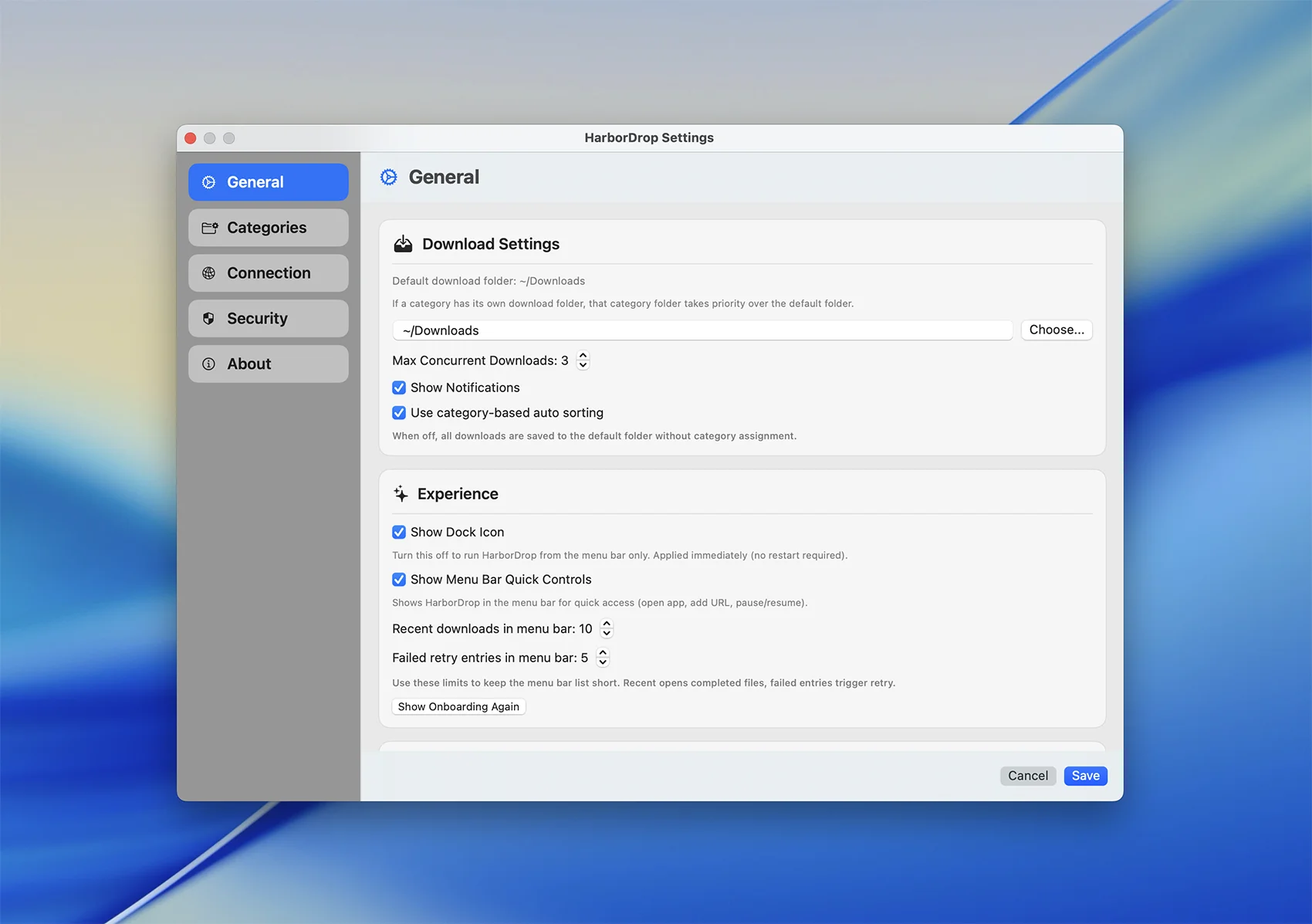 与 Windows 上的 IDM(Internet Download Manager)类似,HarborDrop 为 macOS 带来了分段加速、稳定的恢复下载和清晰的状态跟踪功能,使大文件下载快速可靠。