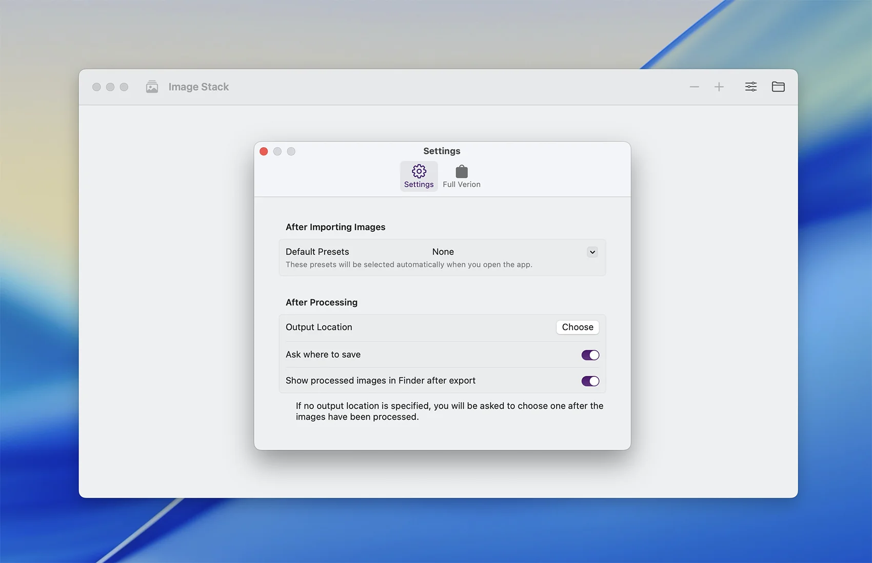 Image Stack 的设计理念清晰高效,专注于一个简单的操作:导入图像、应用预设,即可获得可直接使用的结果——只需点击几下,无需任何繁琐步骤。