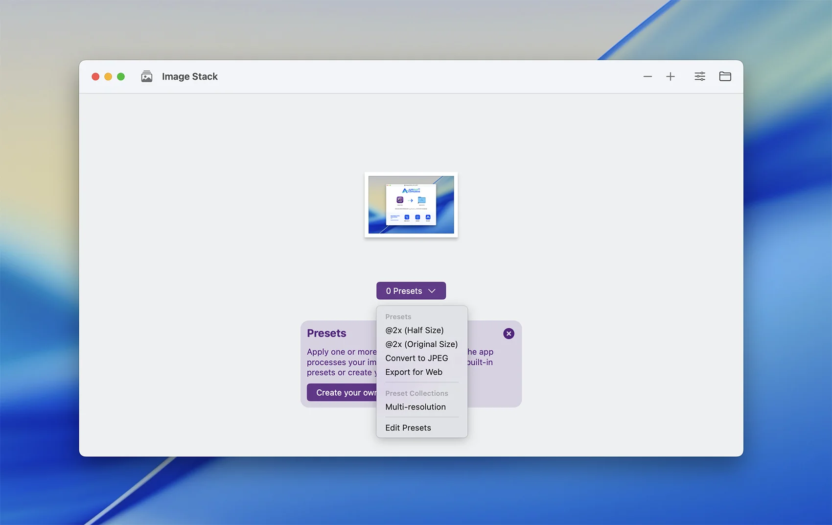 Image Stack 使用预设功能转换图像,轻松更改格式、调整大小、重命名等等。无论您是处理单张图像还是成千上万张图像,Image Stack 都能让您的工作流程快速、一致且轻松。
