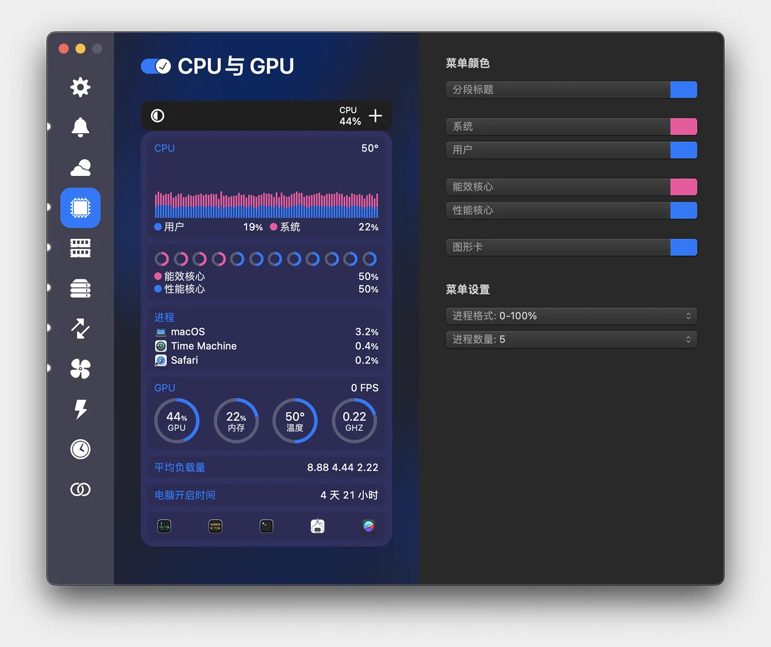 实时CPU图和前5位CPU资源占用者列表。跟踪单个核心或所有核心的使用,以节省空间。此外,支持的Mac电脑上的GPU内存和处理器使用情况以及活动GPU可以显示在菜单栏中。