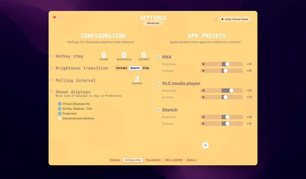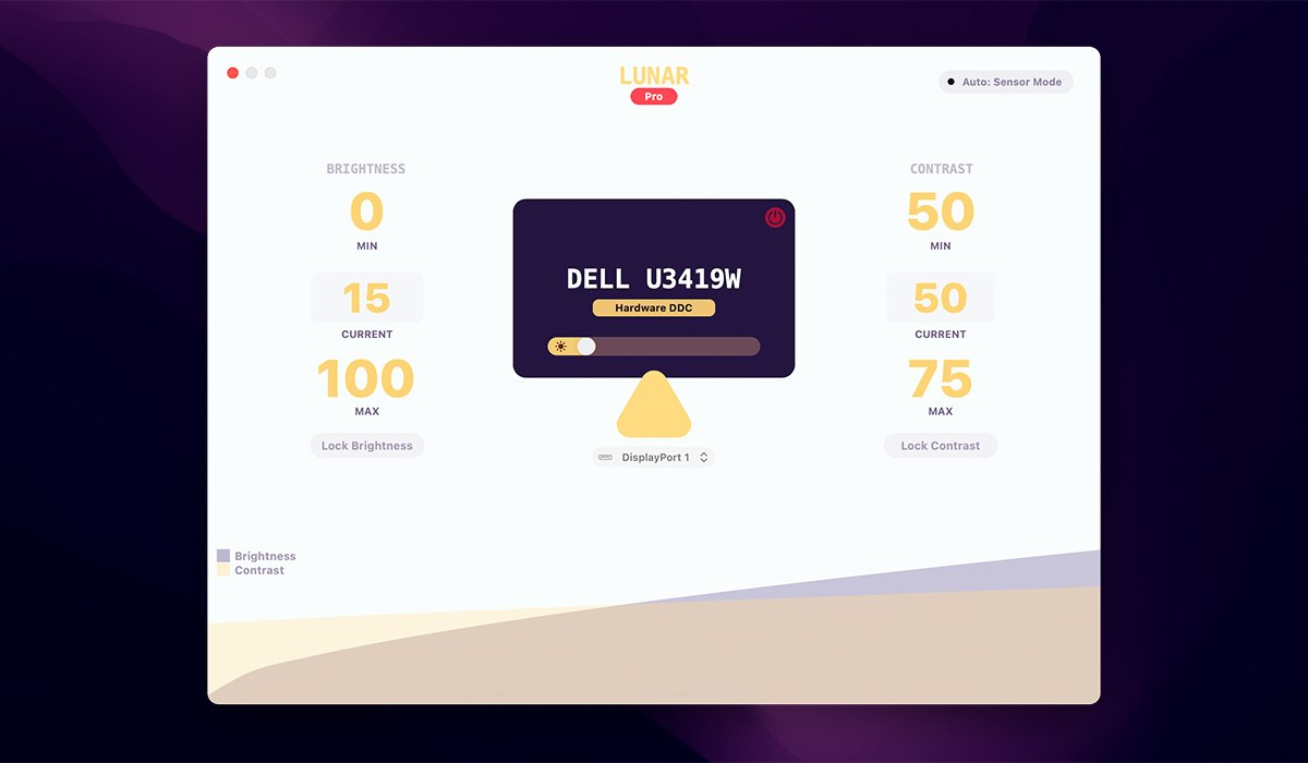 Lunar Pro 是一款 Mac 外接显示器,亮度/对比度/音量调节工具,通过 DDC 硬件级数据控制,支持多台显示器同步参数调节,支持戴尔、LG、三星、联想等大多数现代显示器,适配苹果 M 系芯片电脑。
