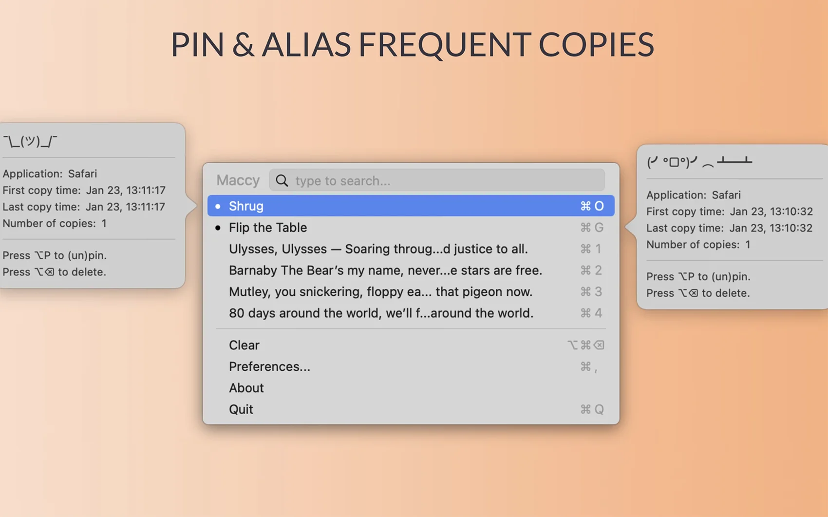 - 要固定历史记录项使其保持在列表顶部,按 OPTION (⌥) + P。该项将移动到顶部并分配一个随机但永久的快捷键。再次按 OPTION (⌥) + P 取消固定。