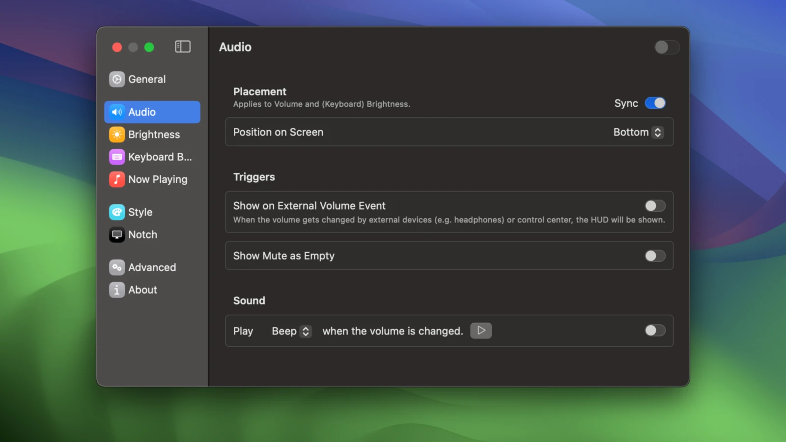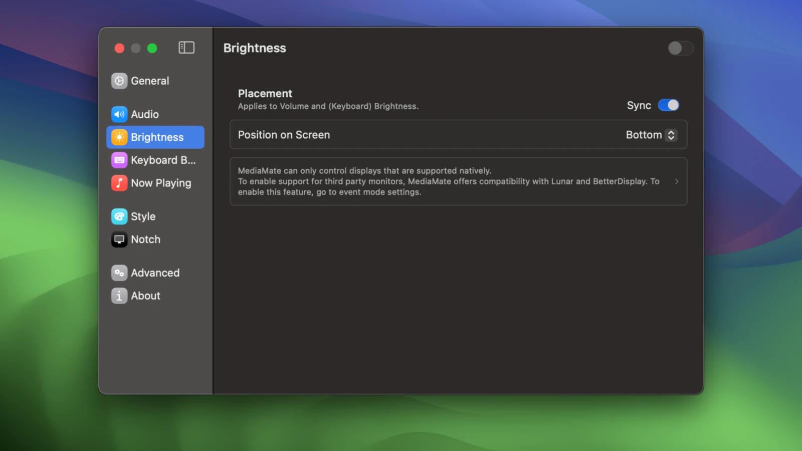- 音量和亮度:MediaMate用新的紧凑型界面替代了macOS系统中默认的老式HUD(头部显示器)。这些新的界面提供更现代化和更直观的控制方式,使您可以轻松调整音量和亮度。