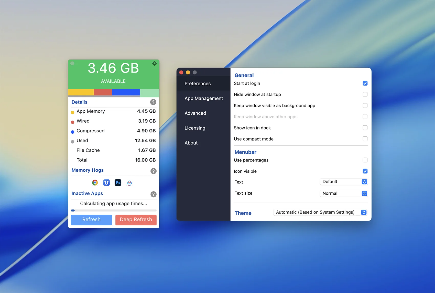 以进度条、仪表盘、百分比等多种样式,清晰展示总内存、已用 / 空闲、活跃 / 压缩 / 缓存内存占比,支持菜单栏常驻、桌面小组件、通知中心展示,数据实时刷新。