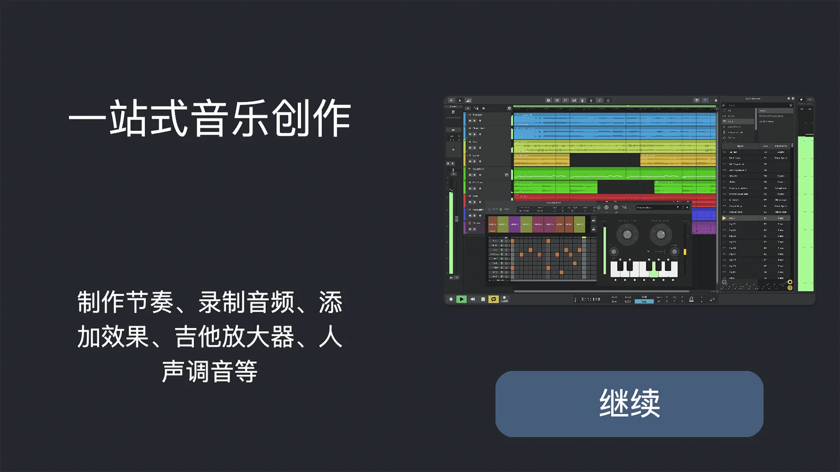 - 钢琴卷帘窗 —— 使用直观的内置钢琴卷轴编辑器编写和编辑用于控制虚拟乐器的MIDI数据。