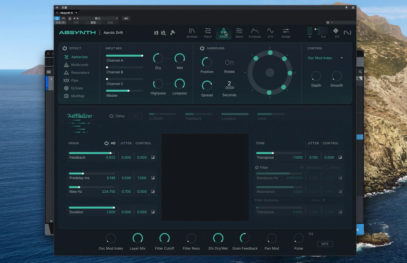 Absynth 6 支持高达八声道的环绕声格式,包括四声道、5.1 声道和八声道,让您可以在 360° 空间中放置和移动声音,并可选配 LFE 路由。每种效果都可以在声场中占据其独特的位置——从旋转的 Aetherizer 颗粒到沉浸式的频谱云。