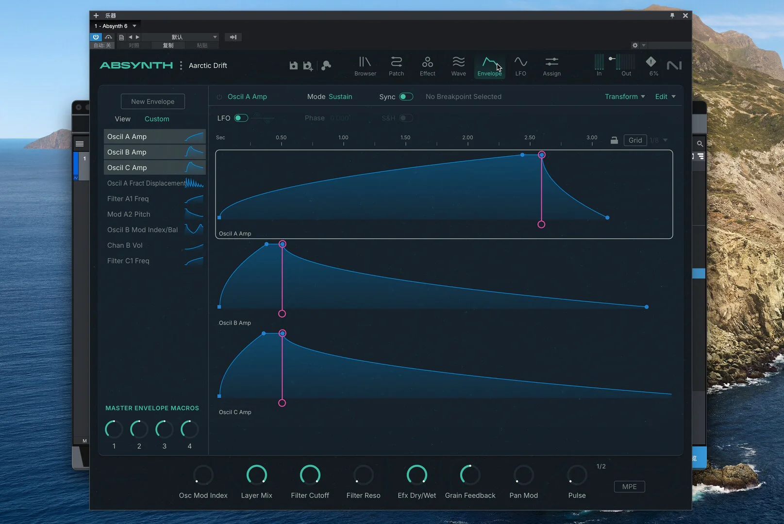 超越 ADSR Absynth 6 的 68 点包络系统提供循环、断点曲线、延音阶段和时间同步过渡——以及专用的调制 LFO。这些灵活的形状让您能够打造不断演变的纹理和节奏律动,远超标准的 ADSR 包络。