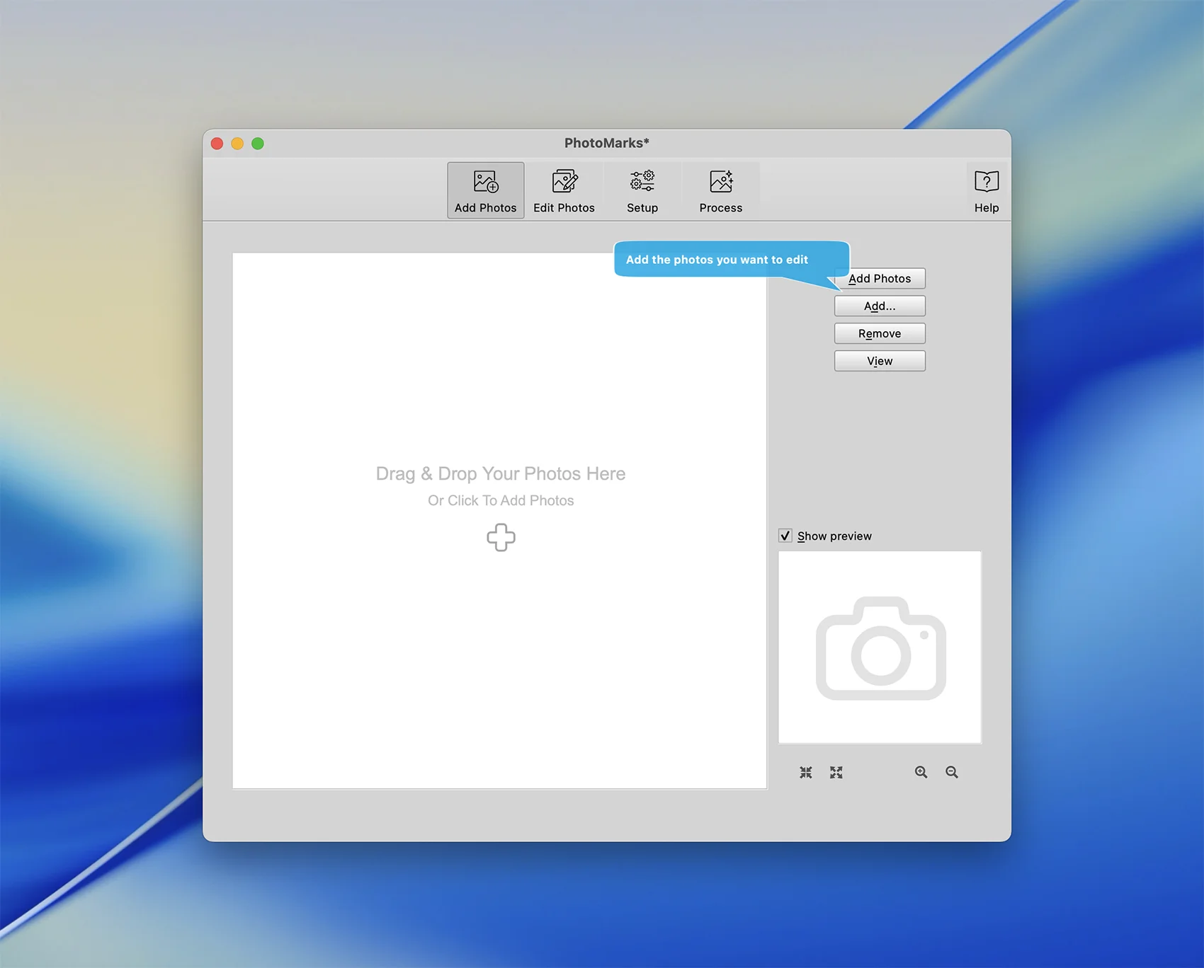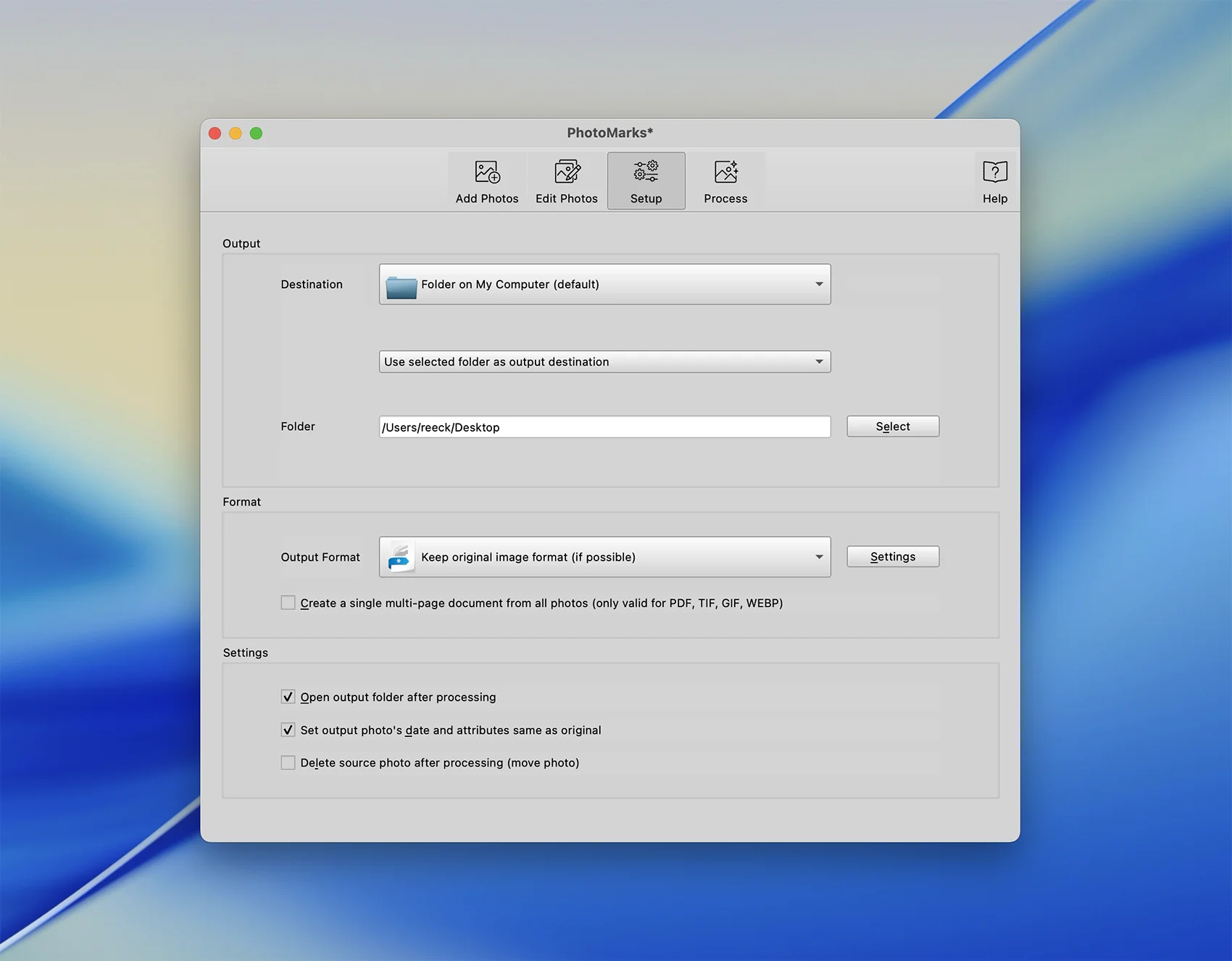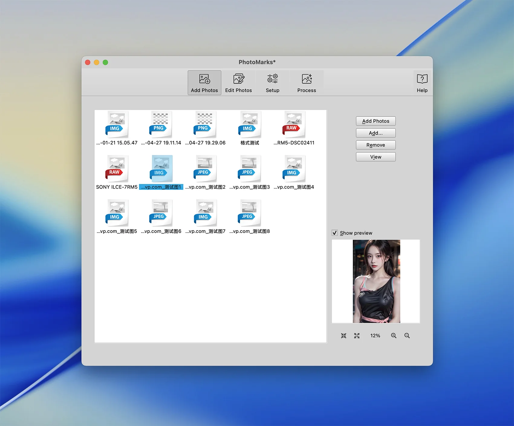 使用适用于 Mac 的 PhotoMarks,您可以完全自定义文字和徽标水印的外观,并在同一会话中执行其他编辑操作,例如调整大小、重命名、自动旋转或为照片添加图形边框。它采用批量编辑模式,并利用多核处理器来加速处理过程。您还可以将设置保存为配置文件,以便日后轻松重复使用。