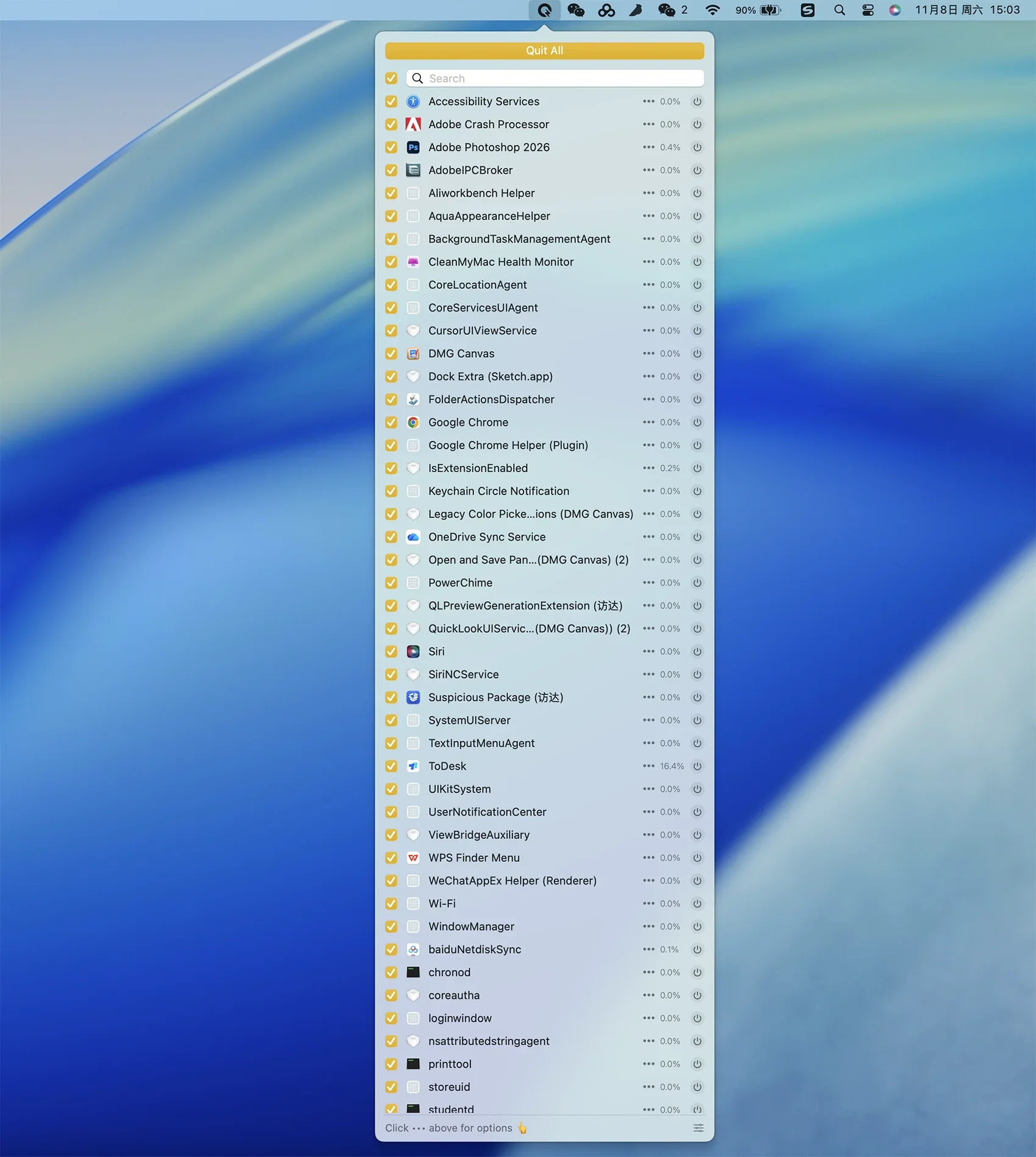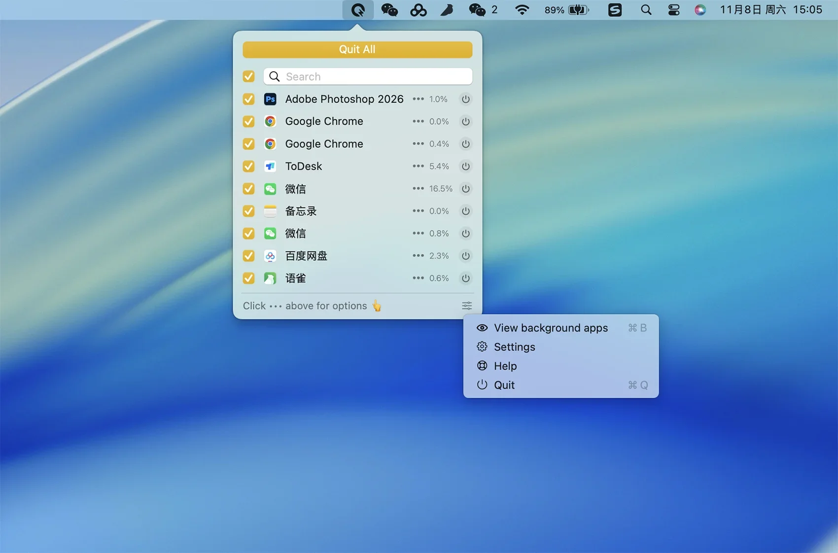 利用 Quit All 的后台应用程序视图,并决定是要退出它们还是让它们继续运行。菜单栏中的 Quit All 助手可以轻松处理此任务。