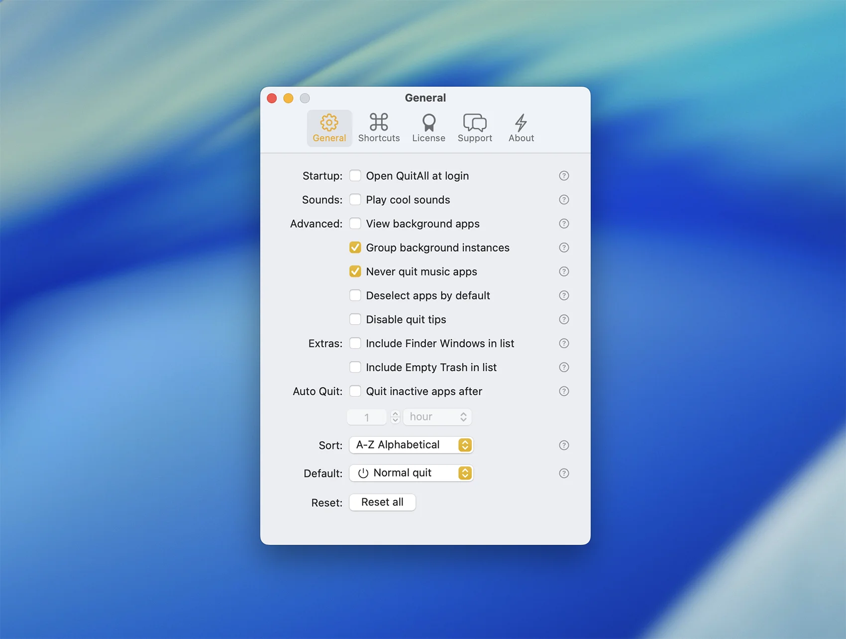 当您希望菜单栏助手与您的桌面融为一体时,Quit All 有一个暗模式。您还可以根据自己的喜好调整众多应用程序设置,即:登录时启动、键盘快捷键、默认退出、音效等等。