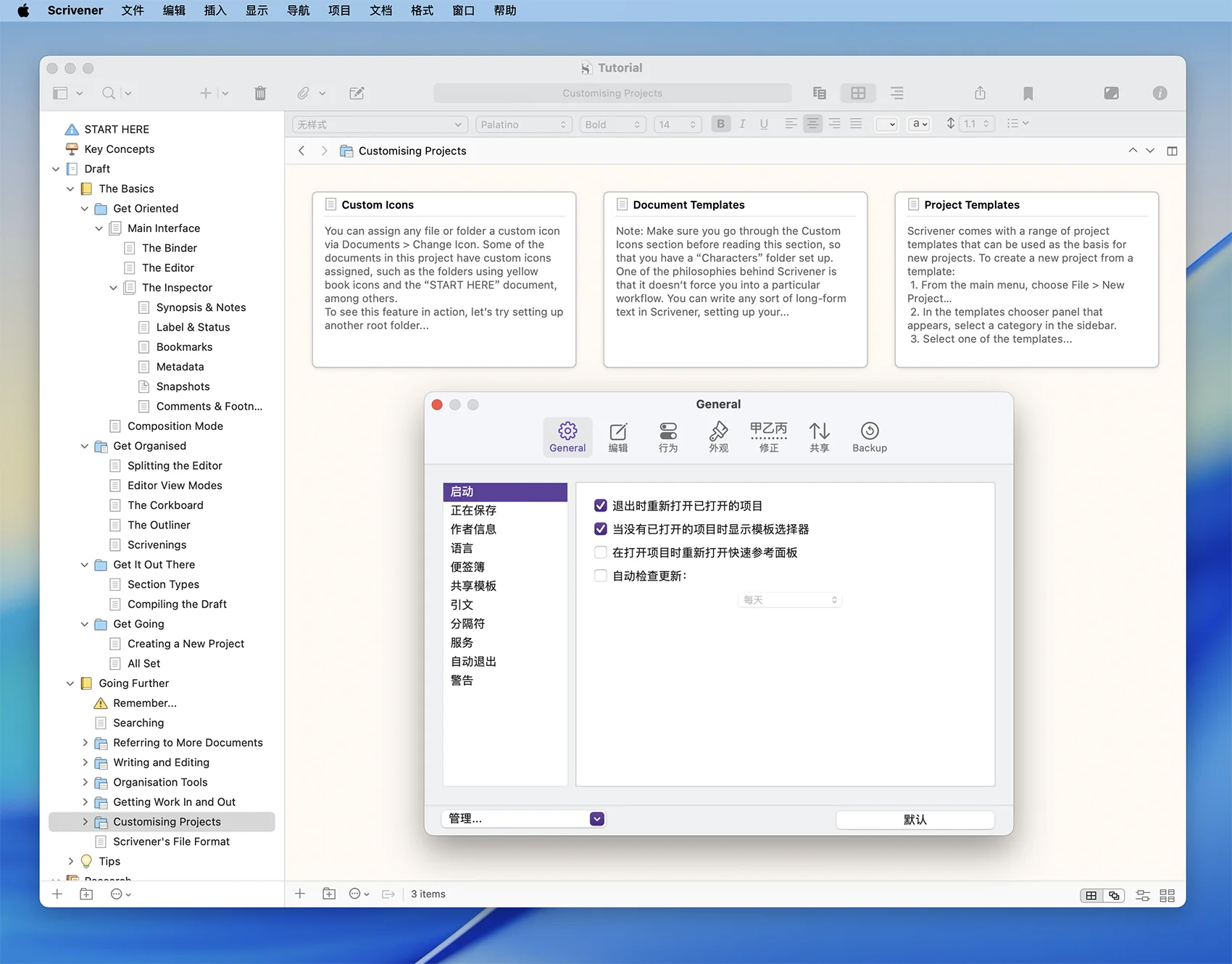 Scrivener会在您工作时自动保存,这意味着您不必担心上次点击“保存”的时间。为了让您更加放心,Scrivener可以在项目打开或关闭时自动备份您的项目,以确保始终将最近的备份安全地移除。