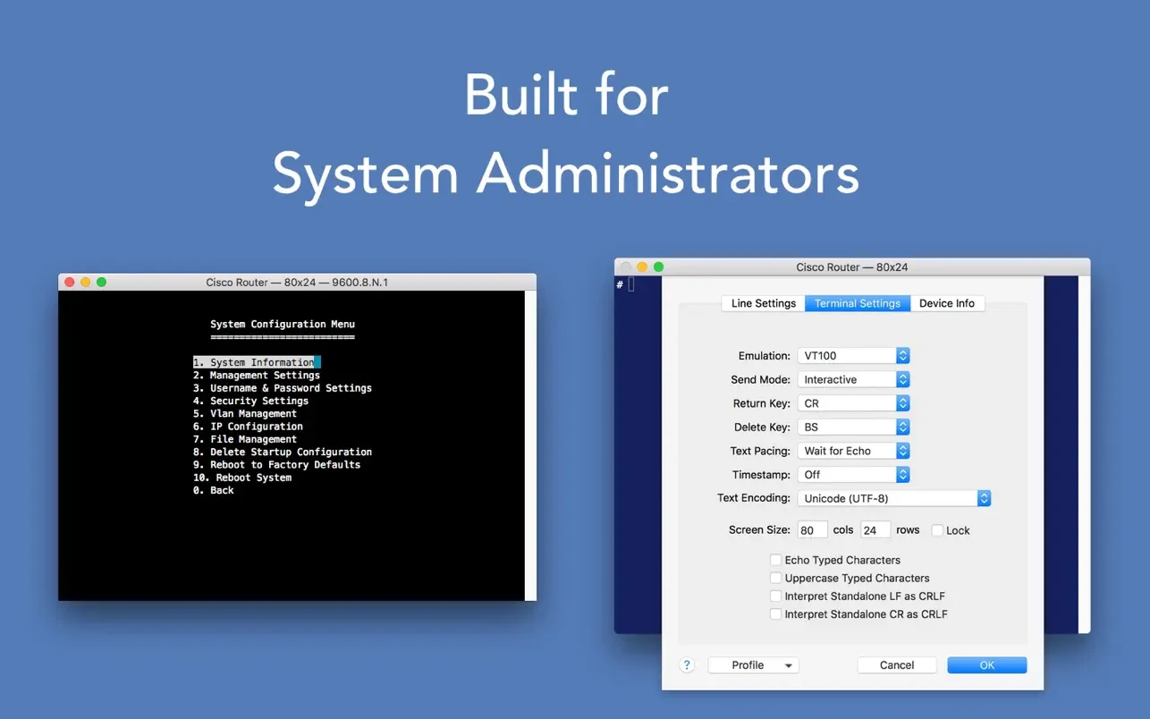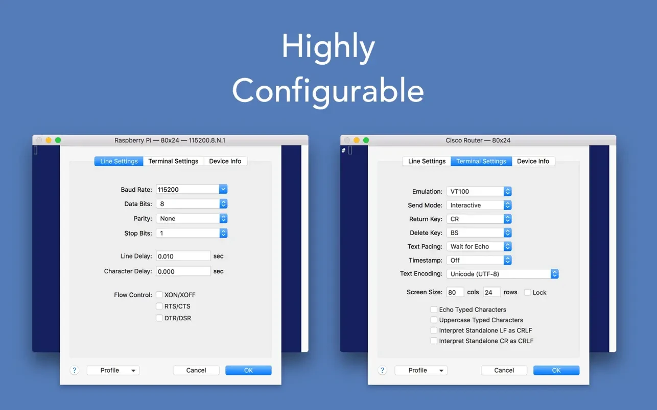 总的来说,Serial for Mac 是一款功能强大的串口通讯工具,可以帮助Mac用户轻松管理和控制串口设备。对于网络管理员来说,Serial 支持使用路由器和交换机时所需的中断序列,甚至可以模拟缺乏直接支持的设备和/或驱动程序的中断。 除了中断之外,文本调整还允许您粘贴大型配置文件,而不会溢出设备的输入缓冲区。