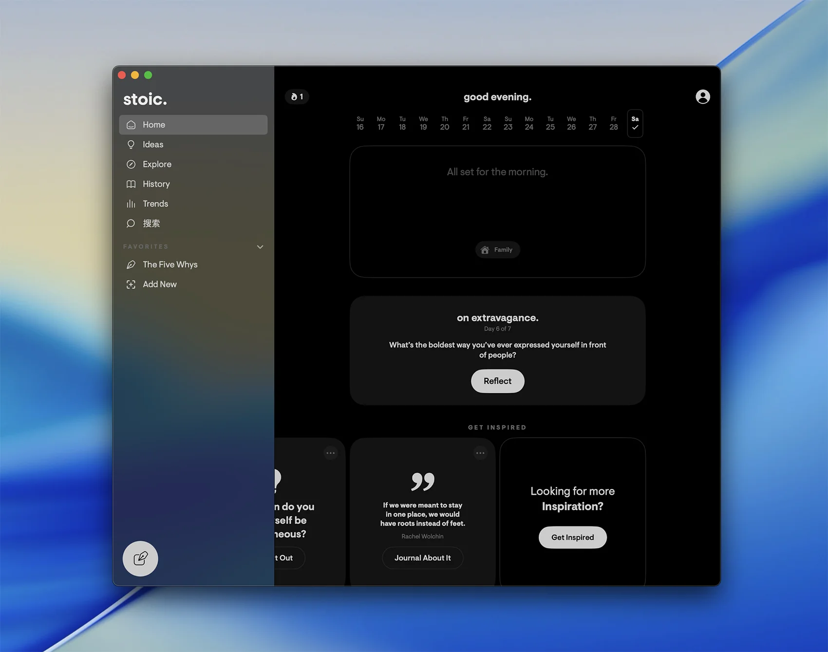 应用提供结构化的环节,帮助你在早晨为即将到来的一天做好准备,晚上则回顾一天的经历。