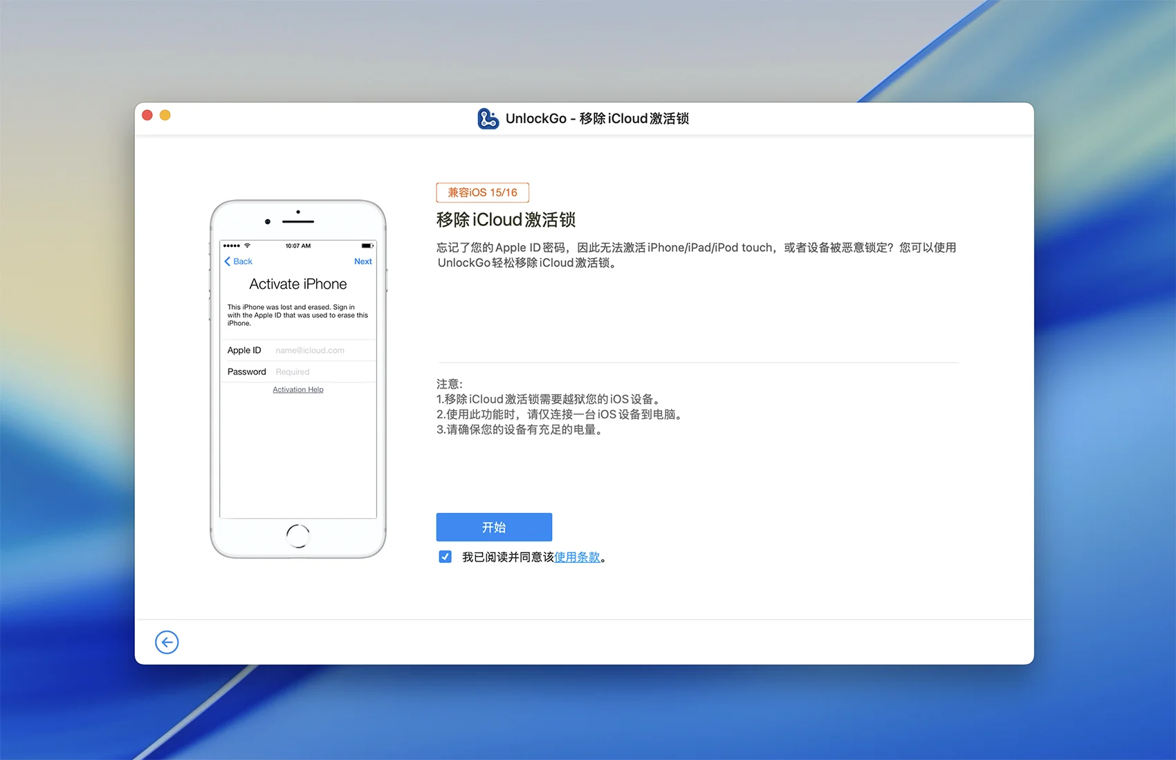 - 注意:仅支持可越狱的iOS设备!解锁 iCloud 激活锁之前需要越狱。