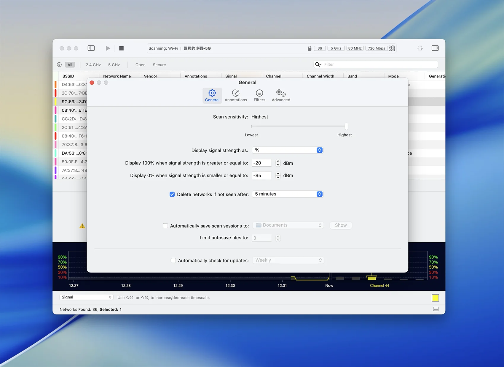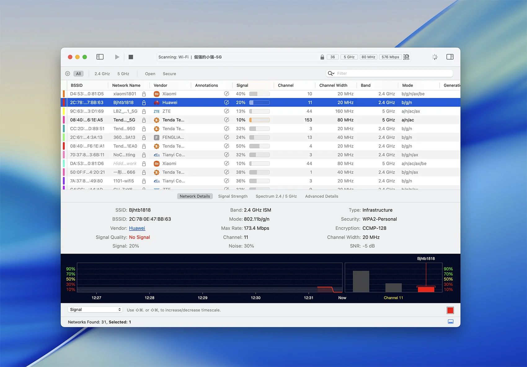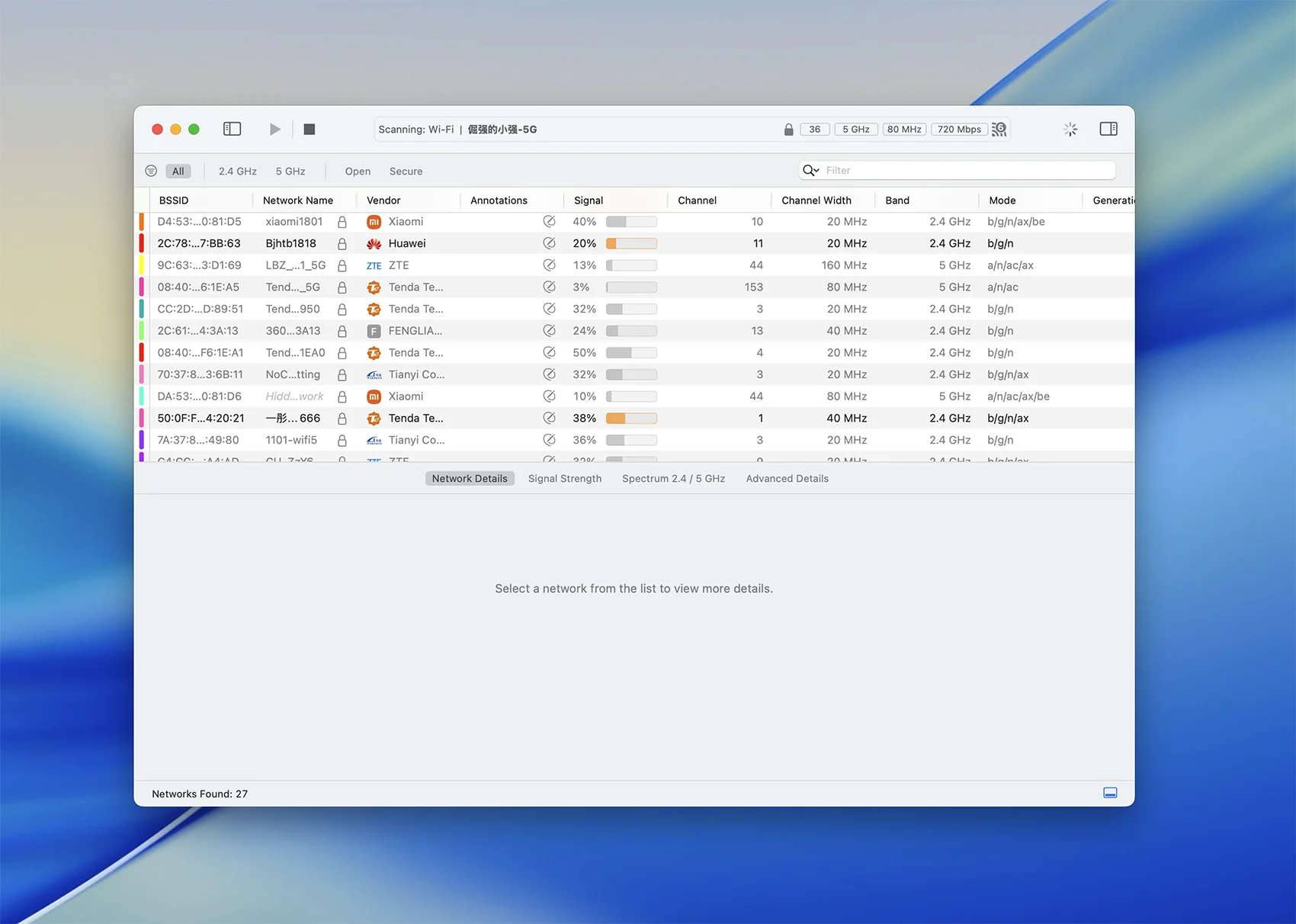 WiFi Explorer查找并显示附近的Wi-Fi网络的配置,包括网络名称(SSID),BSSID,供应商,国家/地区代码,频道,频段,安全配置,支持的数据速率,流数量等等。