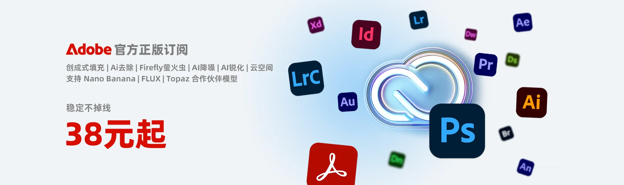 为更好地服务于您的专业需求,我们正式为您开启 Adobe Creative Cloud 全系列产品的正版订阅通道,解锁所有在线云和AI功能。您将通过本站以极具性价比的优惠价格获取 Adobe 正版授权。